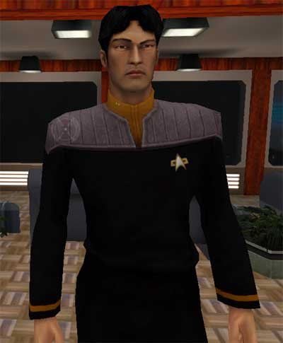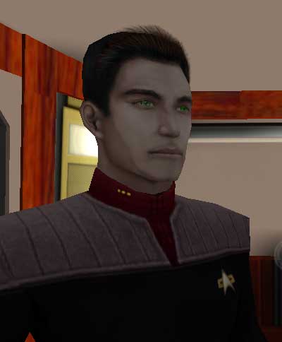 Ensign Rengs Aris: Bajoran security officer assigned to Silverado after the Body-Swap Incident. Serves as the Energy Munitions Expert. Firm believer in the Bajoran Prophets, he and Dr. Wowryk are mortal enemies. Rengs was assigned to Silverado straight from the Academy and was expecting a proper, professional Starfleet crew. Boy, was he surprised! 5’11” or so.